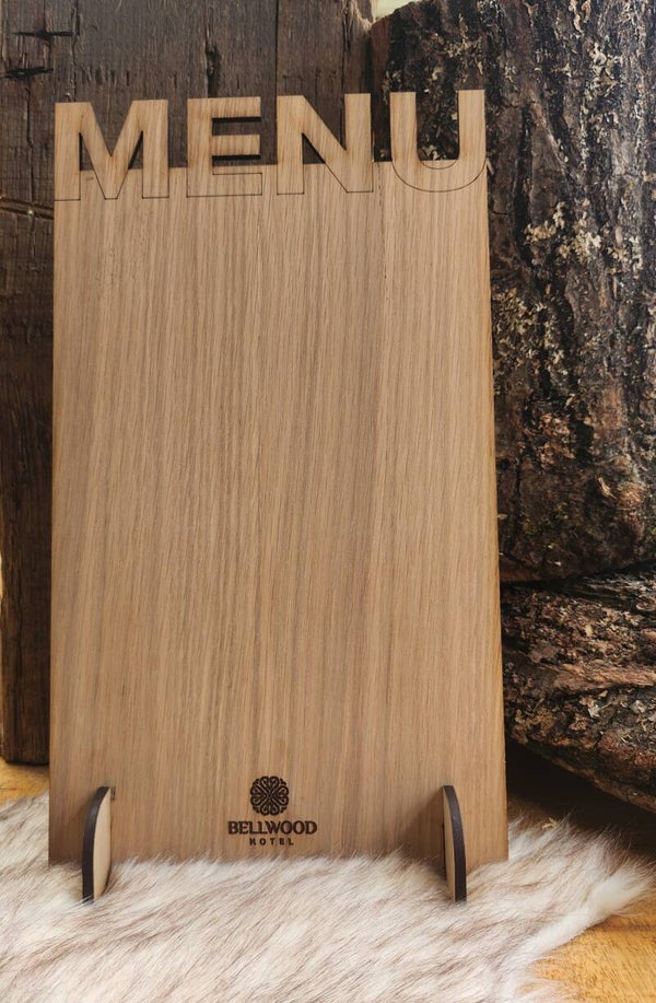 Menukaart van gefineerd mdf (eiken, essen of noten). Inclusief kaarthouderclip.